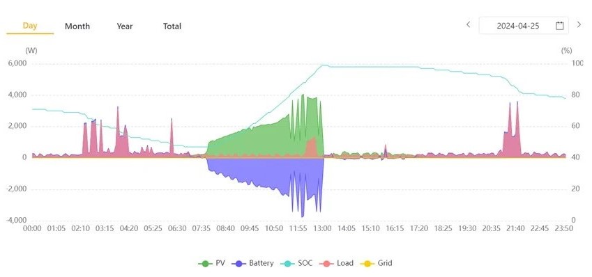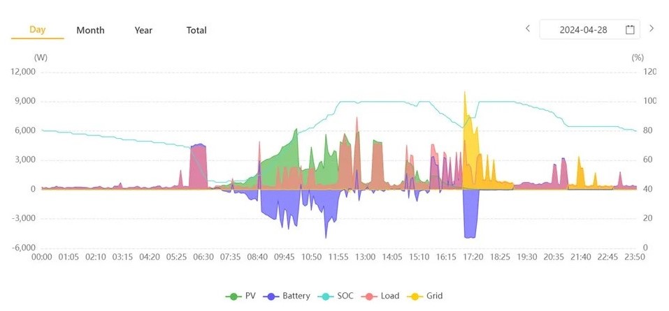 The effectiveness of the grid usage strategy can be observed in the two graphs provided below. In the first graph, a noticeable spike in grid electricity consumption (indicated by the yellow bar) occurs shortly after 17:00, coinciding with the time when the sun is setting. This surge in grid usage is necessary to fully charge the battery to 100% in preparation for the household’s evening energy requirements.